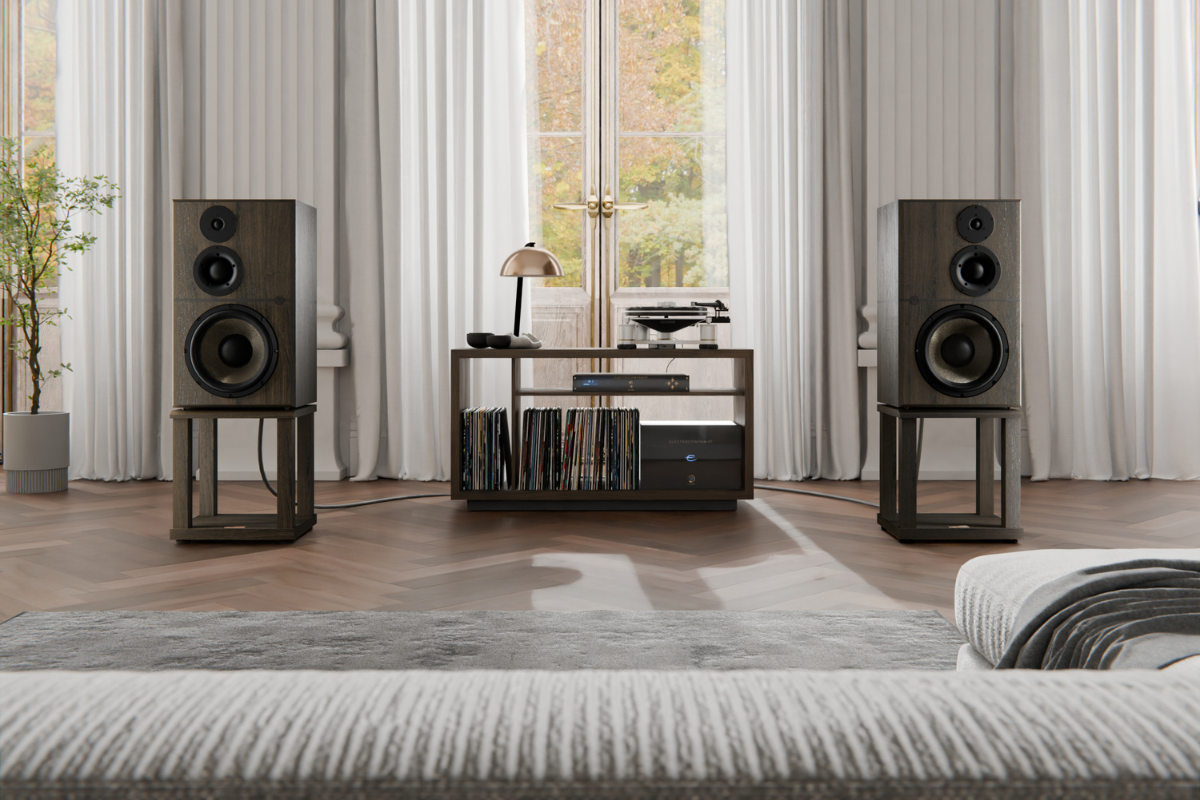 Ébénisterie haute densité et pieds en bois dédiés : un coffret quasiment exempt de vibrations, conçu pour offrir une stabilité parfaite et un confort d’écoute inaltérable.
