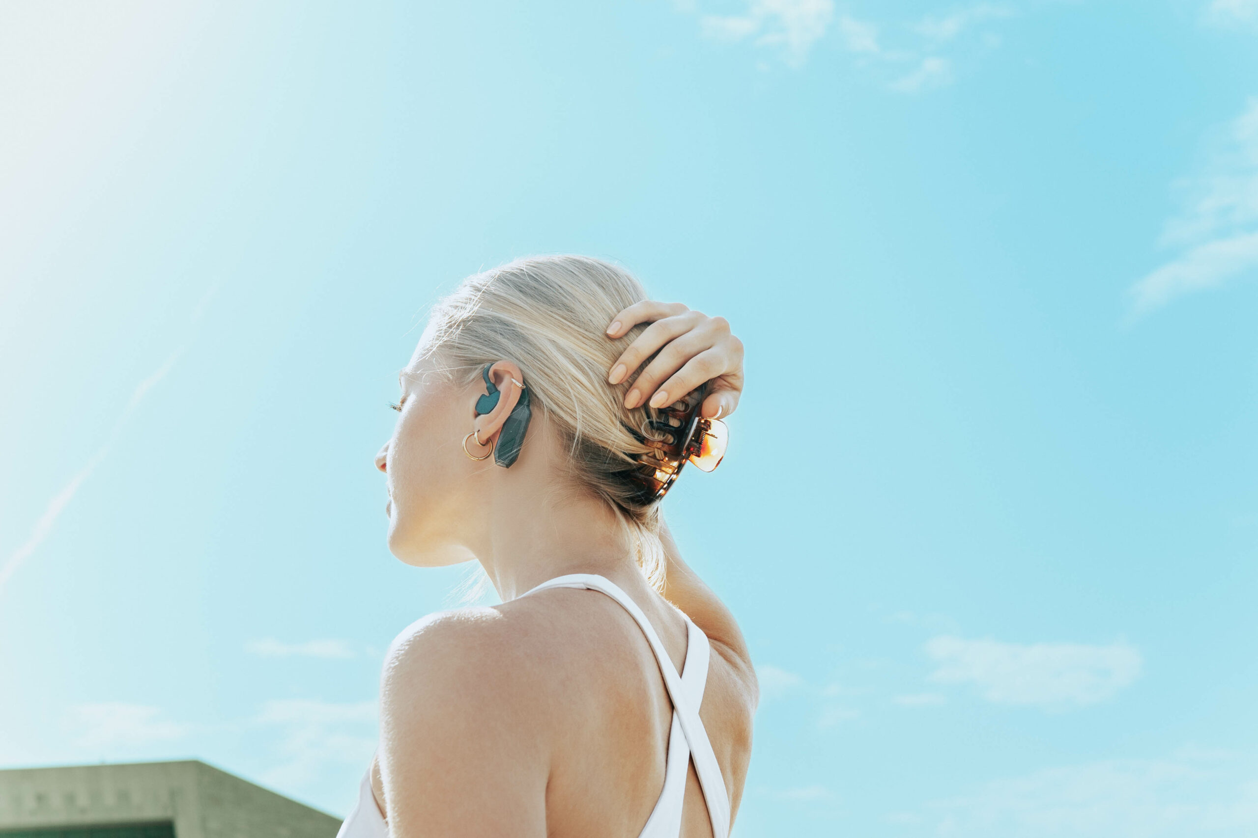 Pour l’usage quotidien, on retrouve des commandes tactiles verrouillables, un micro avec réduction de bruit (Qualcomm cVc) pour des appels clairs, une étanchéité IPX5, et une portée d’environ 10 m. Côté endurance, comptez jusqu’à 7 h d’écoute par charge et jusqu’à 15 h au total avec le boîtier de recharge USB-C. La finition polymère et la forme discrète derrière l’oreille offrent confort et légèreté.