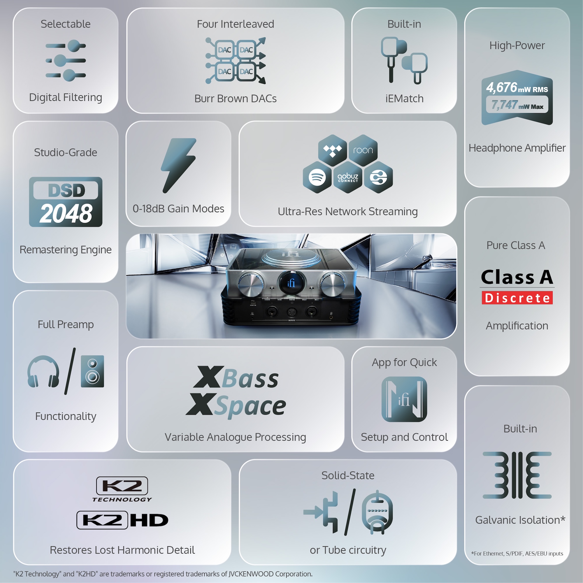 Technologie K2HD : Traitement audio avancé qui restaure les harmoniques perdues lors de la numérisation, rendant le son plus organique et vivant.