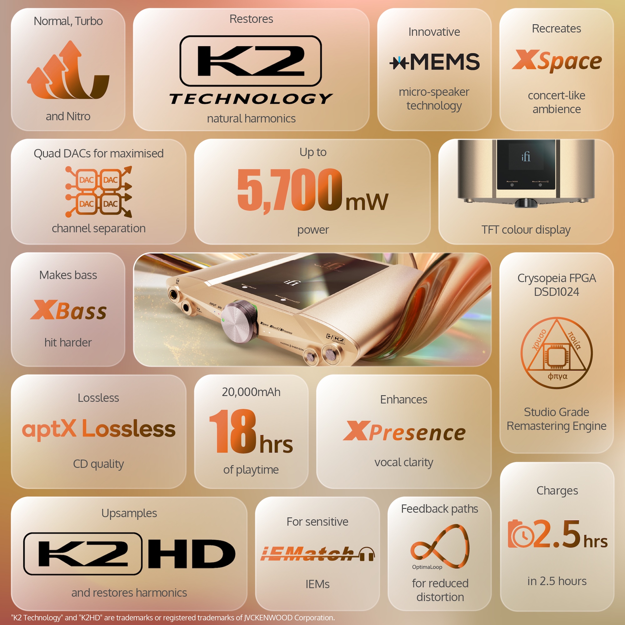 Son amplificateur casque développe jusqu’à 5 700 mW de puissance, capable de driver sans effort des casques très gourmands, y compris les planar magnétiques haut de gamme. Pour enrichir l’expérience, plusieurs traitements sonores exclusifs sont intégrés :